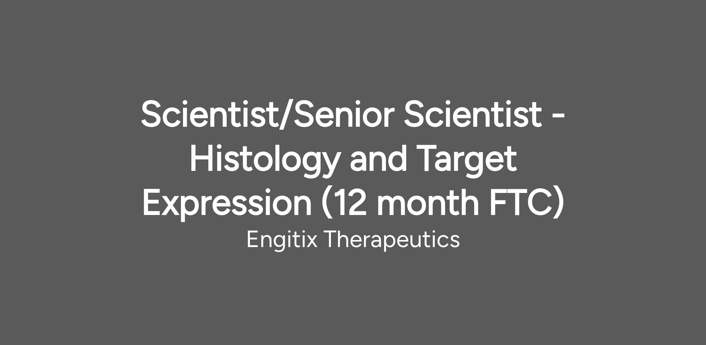 Location: White City, London (expectation of 5 days onsite).Engitix Therapeutics is a pioneering biotech dedicated to unlocking extracellular matrix biology to develop transformative therapies in fibrosis and oncology. We are seeking a Scientist or Senior Scientist (12 month fixed-term contractor) to provide expert histology and tissue-based target validation support across our discovery pipeline.