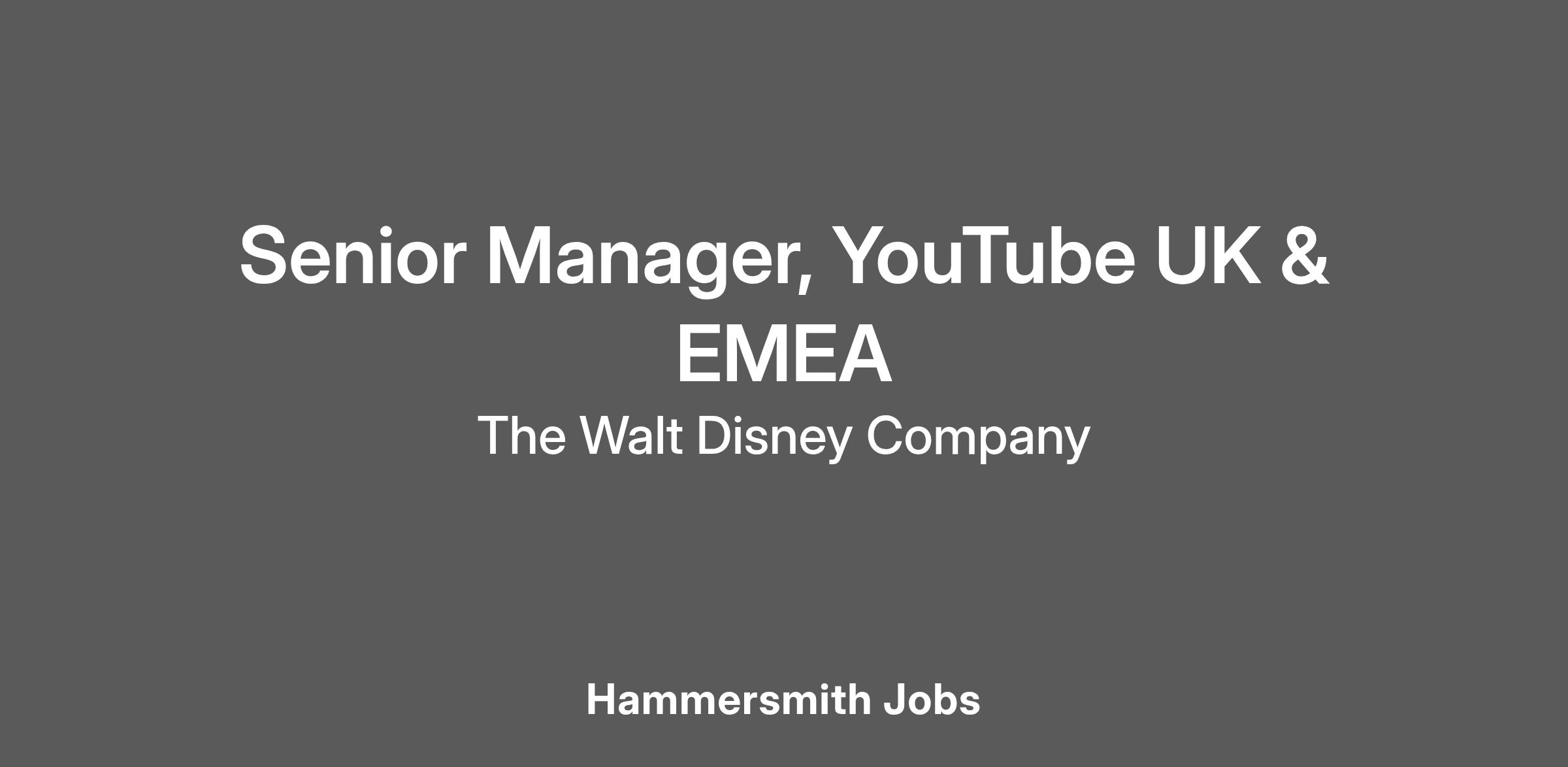 The Senior Manager, YouTube UK & EMEA has direct responsibility for the management, implementation, strategic development and oversight of The Walt Disney Company’s (TWDC) UK & EMEA YouTube channels. This role will play a critical part in developing and leading Disney’s approach to YouTube across EMEA.